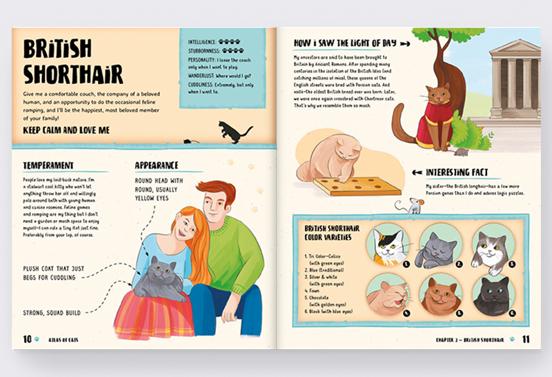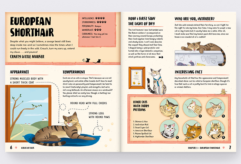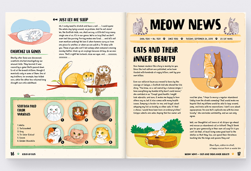 Did you know that some cats don’t have five fingers, but six? We’re not pulling your whiskers—it’s true! Whether you have your own pet at home or whether you just like these adorable little rascals—read our illustrated cat atlas, which will introduce you to the most interesting, lazy, cuddly, and wild cat breeds in the world, from the common European tabby to the silky-haired Persian cat and the unusual Lykoi. And don’t worry, that one over there isn’t a tiny werewolf—it just looks like one. And if you enjoy bedtime stories, don’t forget to cuddle up in bed and immerse yourself in the Meow News, a newspaper that comes with the atlas. It contains many stories, interviews, and news from around the world of renowned feline celebrities, as well as lesser-known cat heroes and heroines.