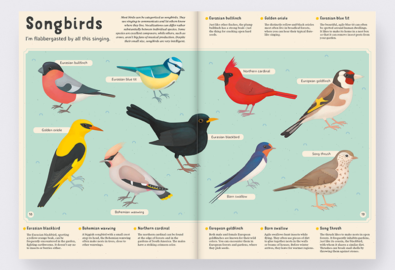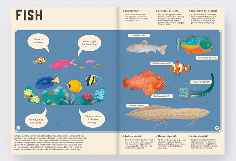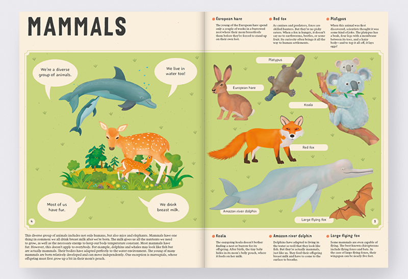 Vast numbers of animals live here on Earth, from tiny insects to large mammals. The animal world is varied and quite interesting. This encyclopedia will introduce you to several hundreds of the best known and most interesting animals on the whole planet, and to top it off , it will help you put each one of them into the right group. This book will show you an attractive selection of mammals, rodents, ungulates, primates, predators, cetaceans, birds, fish, cartilaginous fish, amphibians, reptiles, insects, and other animal groups that can be found all over Earth. Beautiful illustrations and simple texts make this book indispensable for all children.