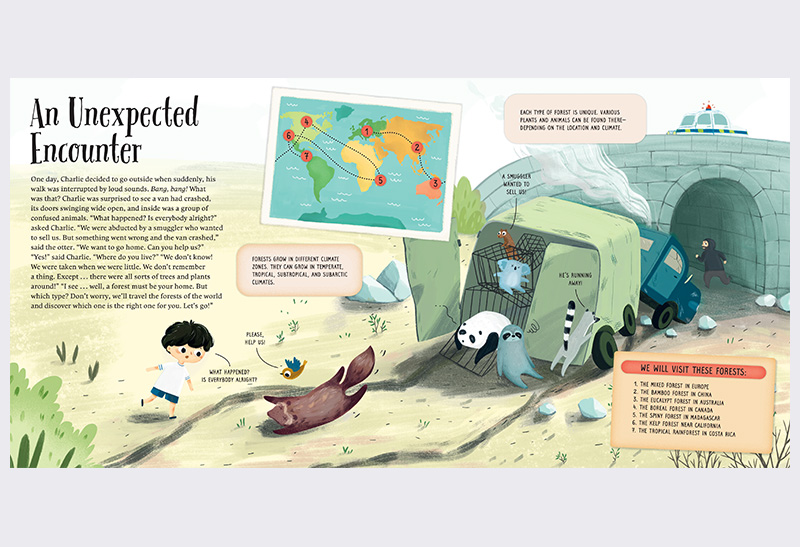 Go around the world with us and get to know different types of forests and its inhabitants as well as plant. Our animal friends will join you on this journey. They’re having the adventure of a lifetime: they want to get to the home they belong to. But what if they don’t know where their home is? Luckily, they have Charlie. He’ll accompany them on their journey to see and discover various forests to find which one is the right one for each of them. And what happens after they reach their final destination? We’ll sure the animals will love to tell you. Join us on our journey along which you’ll learn many new things!
