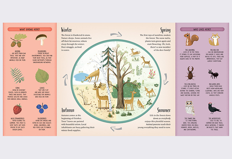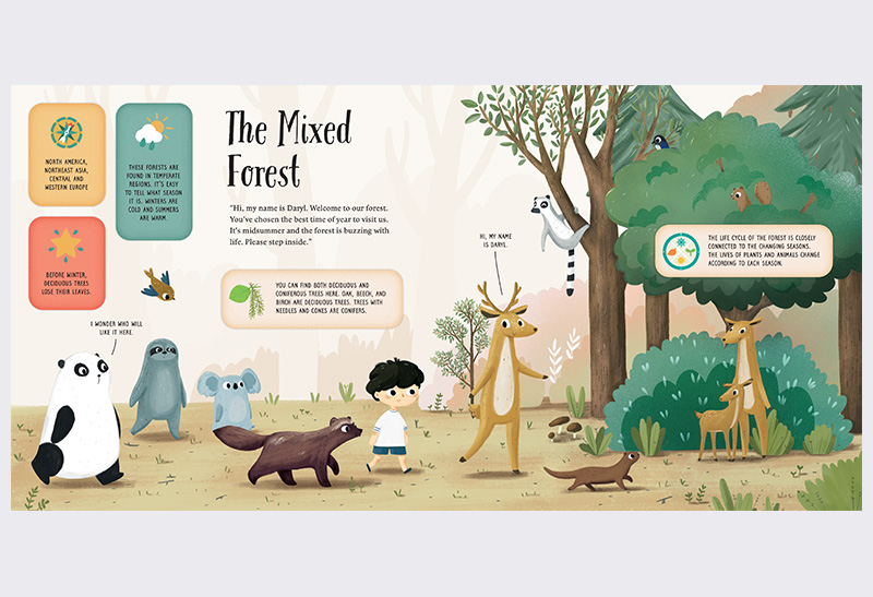 Bite-sized facts about forests from around the globe, pointing out the animals and plants found in them, as well as the unique features and inner workings of these environments.