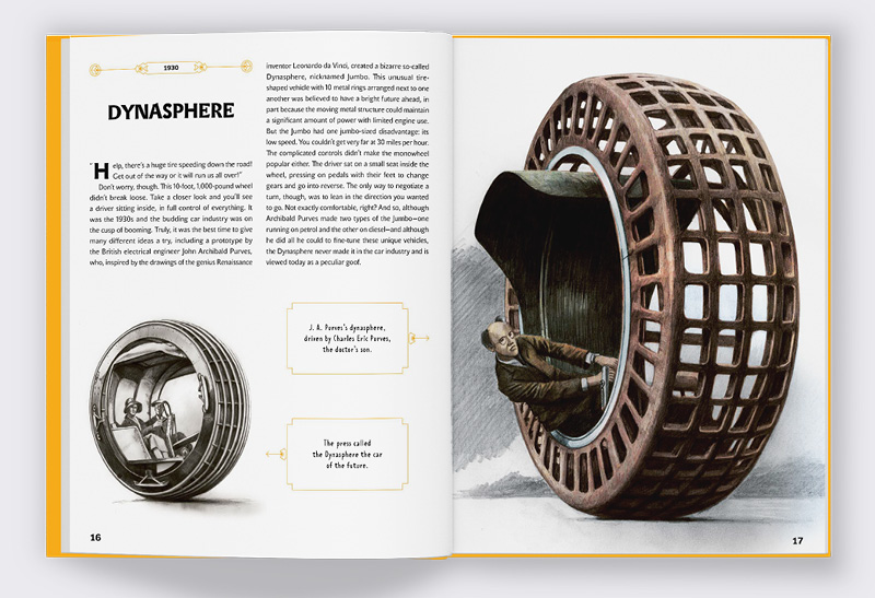 We all travel sometimes—by car, public transport, or plane. But there are some means of transport we completely ignore. Let’s crack open this book, wonderfully illustrated by Martin Sodomka, and learn how come we don’t travel in flying cars, why trains don’t ride on a single rail, or why there are no life-size remote control cars! You’re about to be flooded with infamous ideas, prototypes, and crazy attempts at coming up with something new over the course of the last century. The means of transport presented in this book may have not led to a technological revolution but did help us progress. After all, people learn from their mistakes.