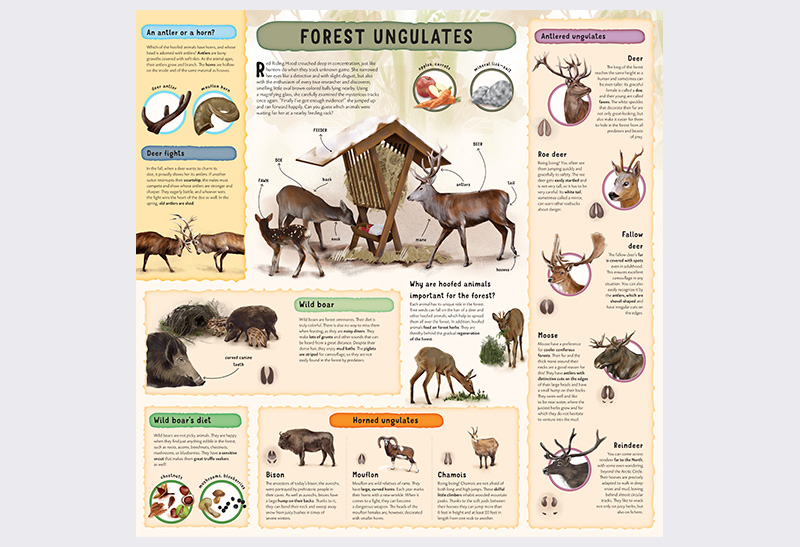 What are these animals and how do they live? You can find out on the pages of this richly illustrated book Observing the Animals of the Forest with Red Riding Hood which uniquely connects the famous fairy tale with an encyclopedia full of the most interesting information about animals of the forest and its surroundings.