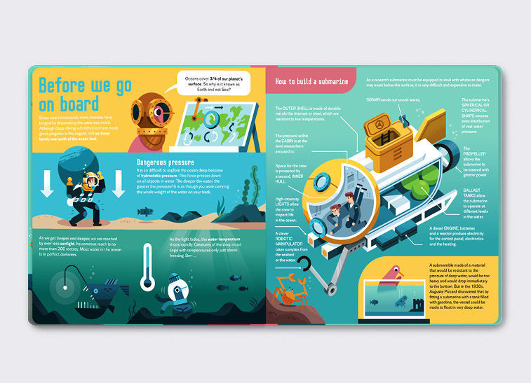 Join Karl the kiwi bird on a deep-sea adventure, uncovering submarines, marine life, and ocean secrets with vivid illustrations and kid-friendly infographics.
