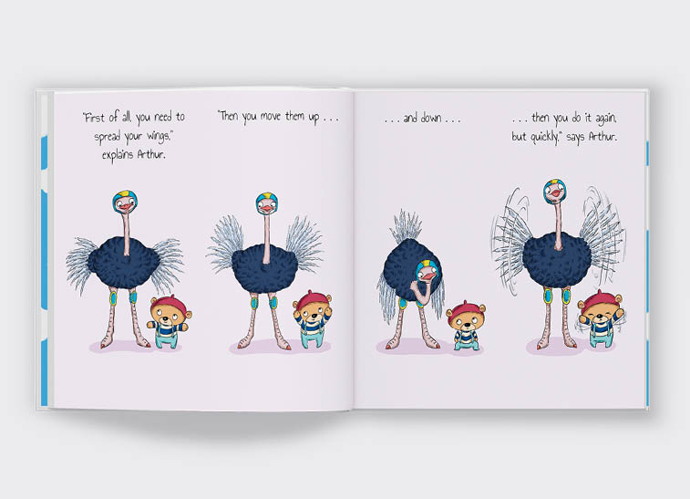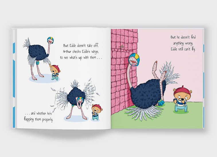 Delve into a charming picture book where Arthur the bear and his bird friend Eddie go on an adventure to teach Eddie how to fly.