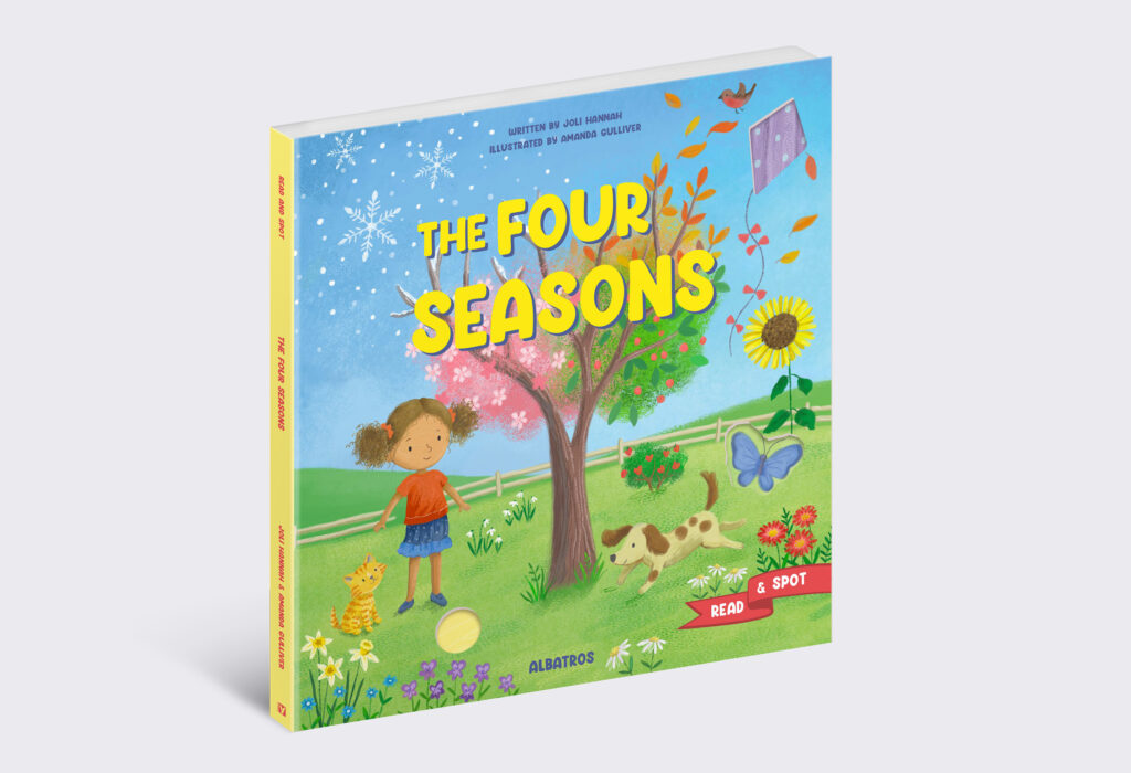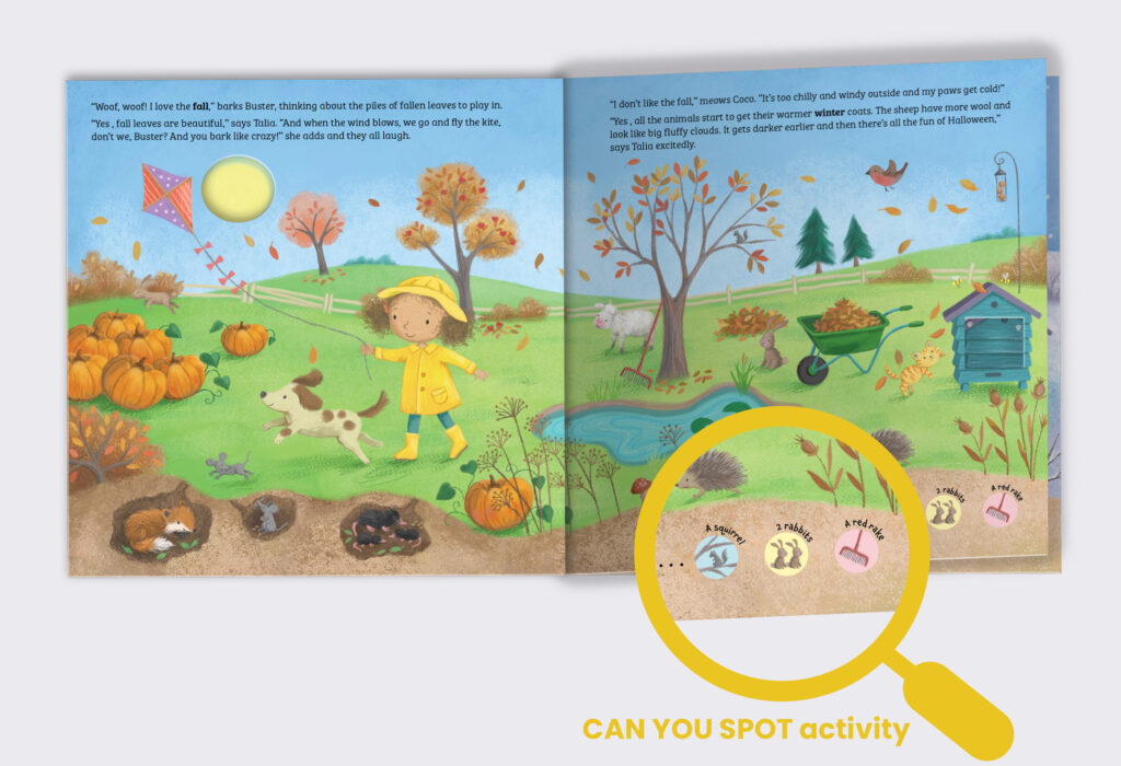 Little story with cute characters explaining the basics of seasons and weather changing in an interactive format accompanied with a search and find game.