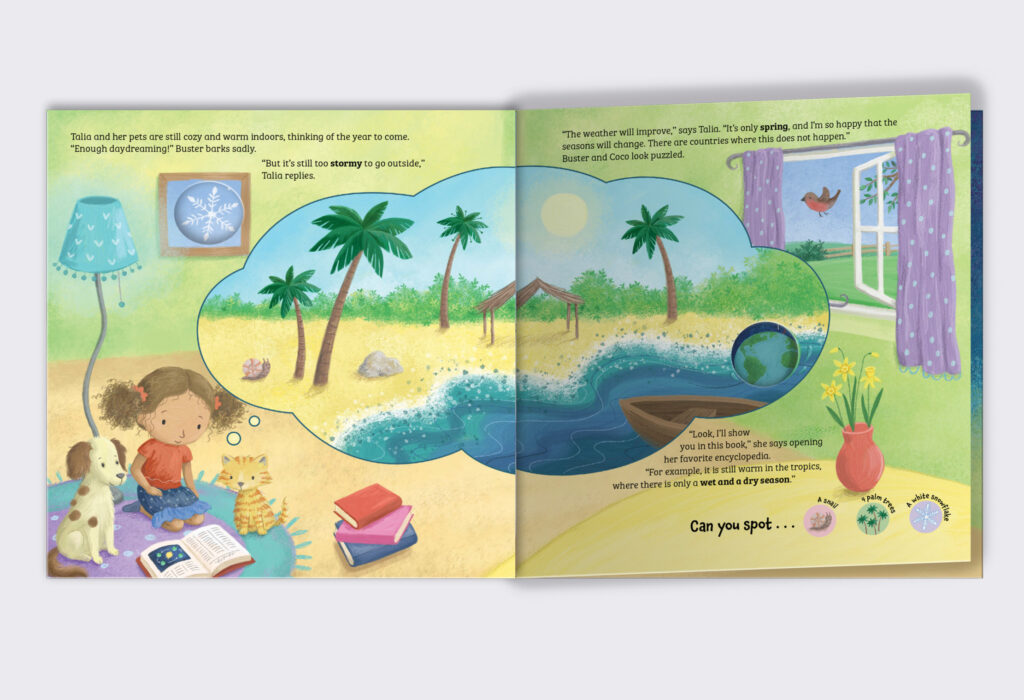 In this story we learn all about the seasons with Talia and her two pets, Coco the cat and Moon the dog. Children will find out about the joys and differences of each season. For the more curious, there is also some basic planetary science and simple explanation as to why we have seasons. Make learning fun!