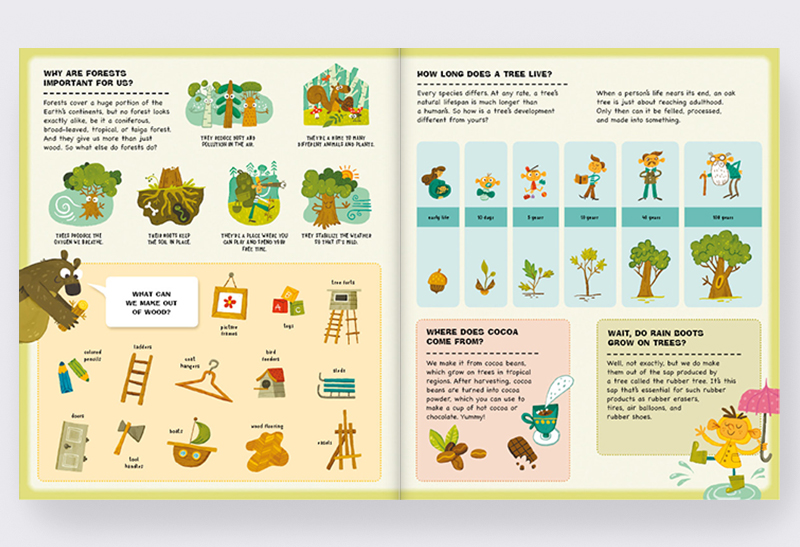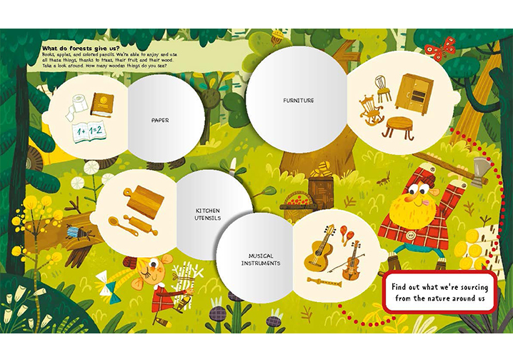 Have you ever wondered how many of the things around us come from nature? There are so many things, including wooden furniture, metal utensils, beeswax, and bread. We rarely—if ever—think about how diffi cult all this was to make. How long did a tree grow before it became the chair you’re now sitting on? How did a cow’s milk turn into the ice cream that cools you off in summertime? This book will show you which materials go into making the stuff we use in our everyday lives. Look beneath the flaps and find out what we’re sourcing from the natural world around us.