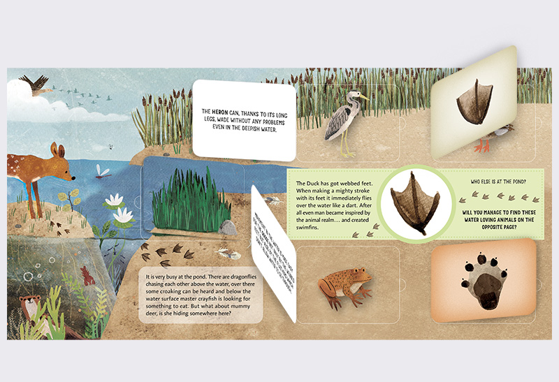 A little fawn gets lost in the forest . . . Anxious and confused, he leaves in search of his mom, following a trail in the soil of the forest. But were these tracks really left by Mother Deer? Maybe someone else went this way. On his expedition, the fawn learns a lot about all kinds of animals. What makes the squirrel such a great climber? What do the tracks of a horned owl look like? Do you know which animal is the quietest when it’s moving? Or how a duck uses its legs to swim? If you help the fawn find his mom, a surprise will await you under every flap. And maybe you will recognize some tracks left in the soil or in the snow on your next walk!