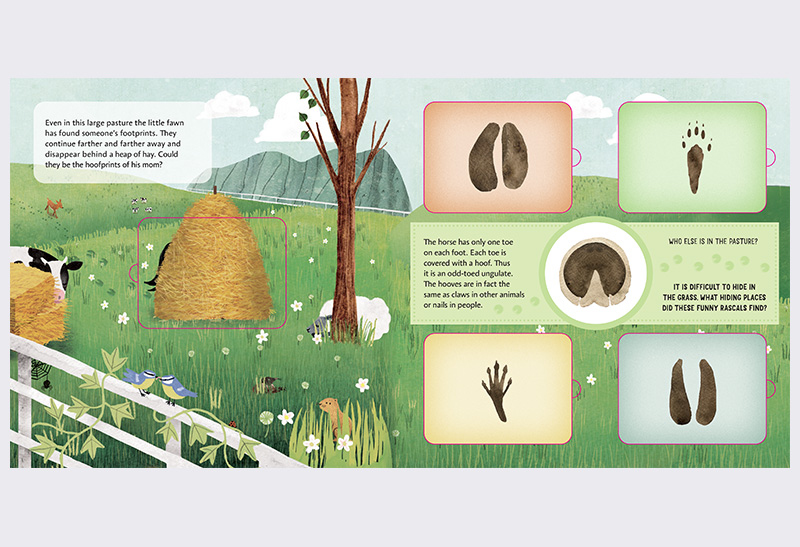 The story of a lost little fawn. Following his mom’s trail, we learn about animals and their footprints. It’s an exciting exploration—with animals hidden under the flaps!