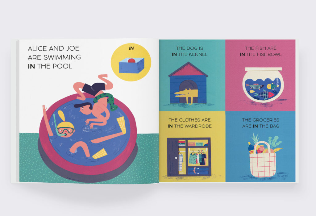 A fully illustrated bilingual book teaching kids spatial prepositions in English and Spanish using visual examples for easy remembering and a little game to exercise the obtained knowledge.
